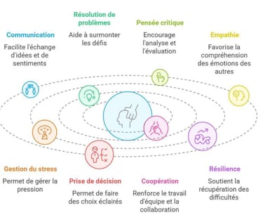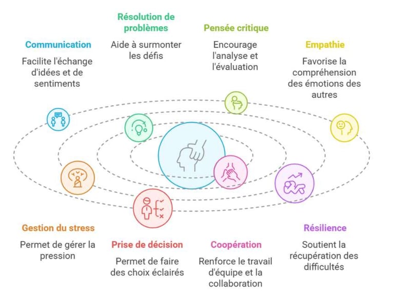 Ces compétences comprennent entre autres la communication, la résolution de problèmes, la pensée critique, l'empathie, la gestion du stress, la prise de décision, la coopération et la résilience. Les compétences psychosociales sont essentielles pour le bienêtre mental, émotionnel et social, ainsi que pour la réussite scolaire et professionnelle.